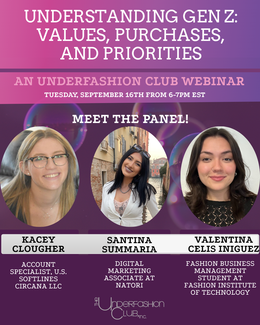 “Understanding Gen Z: Values, Purchases, and Priorities” was a webinar hosted by The Underfashion Club which dove into the mindset of Gen Z, those born roughly between 1997 and 2012, and explored how their unique values shape spending behavior and consumer priorities. It’s not just about what they buy, but why they buy. Held on 9/16/2025 from 6-7PM and moderated by Ellen Lewis, board member of The Underfashion Club, the webinar asked the panel members whose ages range from 23-28 about their own experiences.